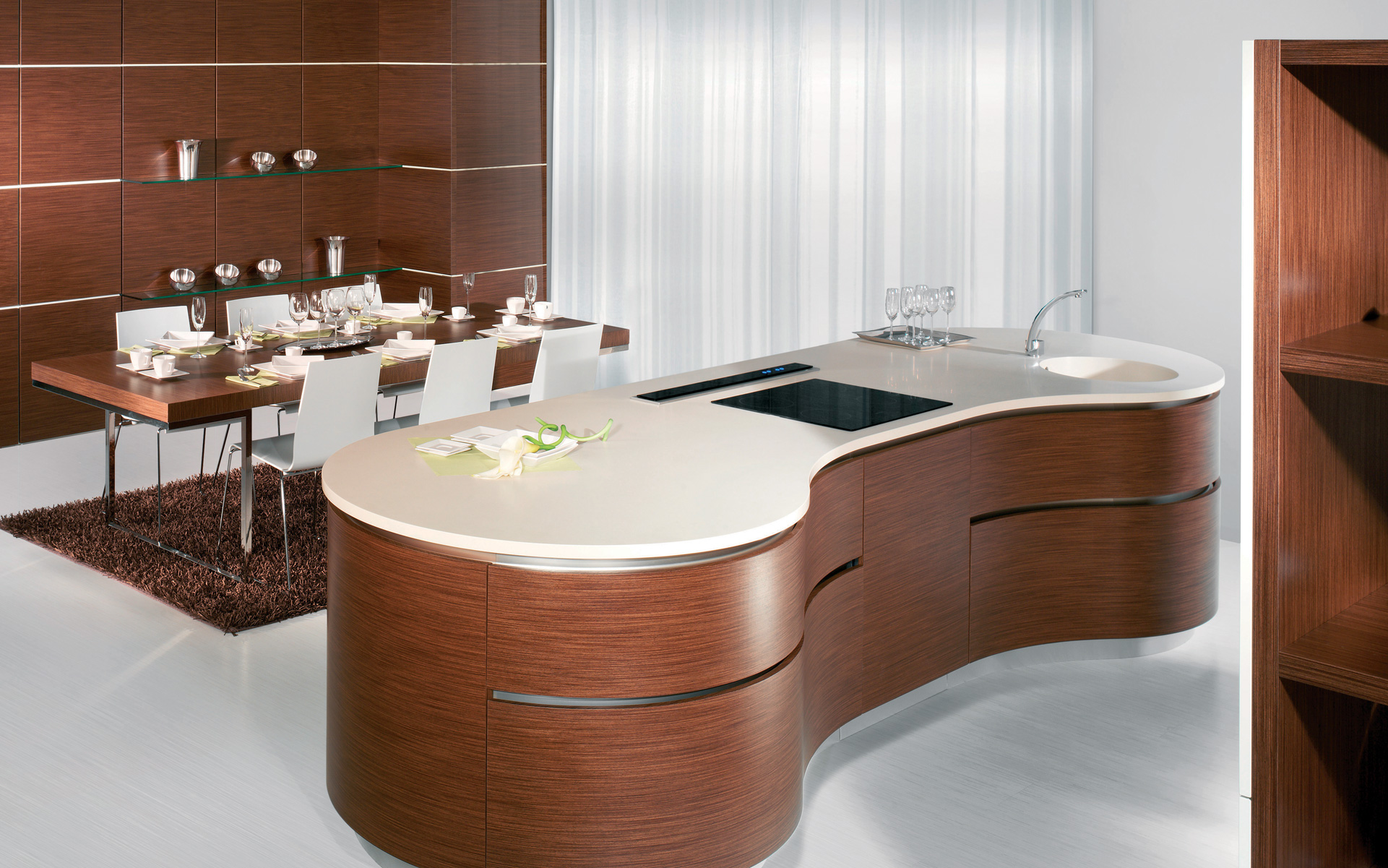 Jedna z nejkrásnějších prémiových kuchyní. Můžete v ní sledovat kontrast kulatých i přímočarých tvarů a použitou dýhu a lak – vše se pojí do jednoho neodolatelného celku, který je novodobý i nadčasový zároveň.