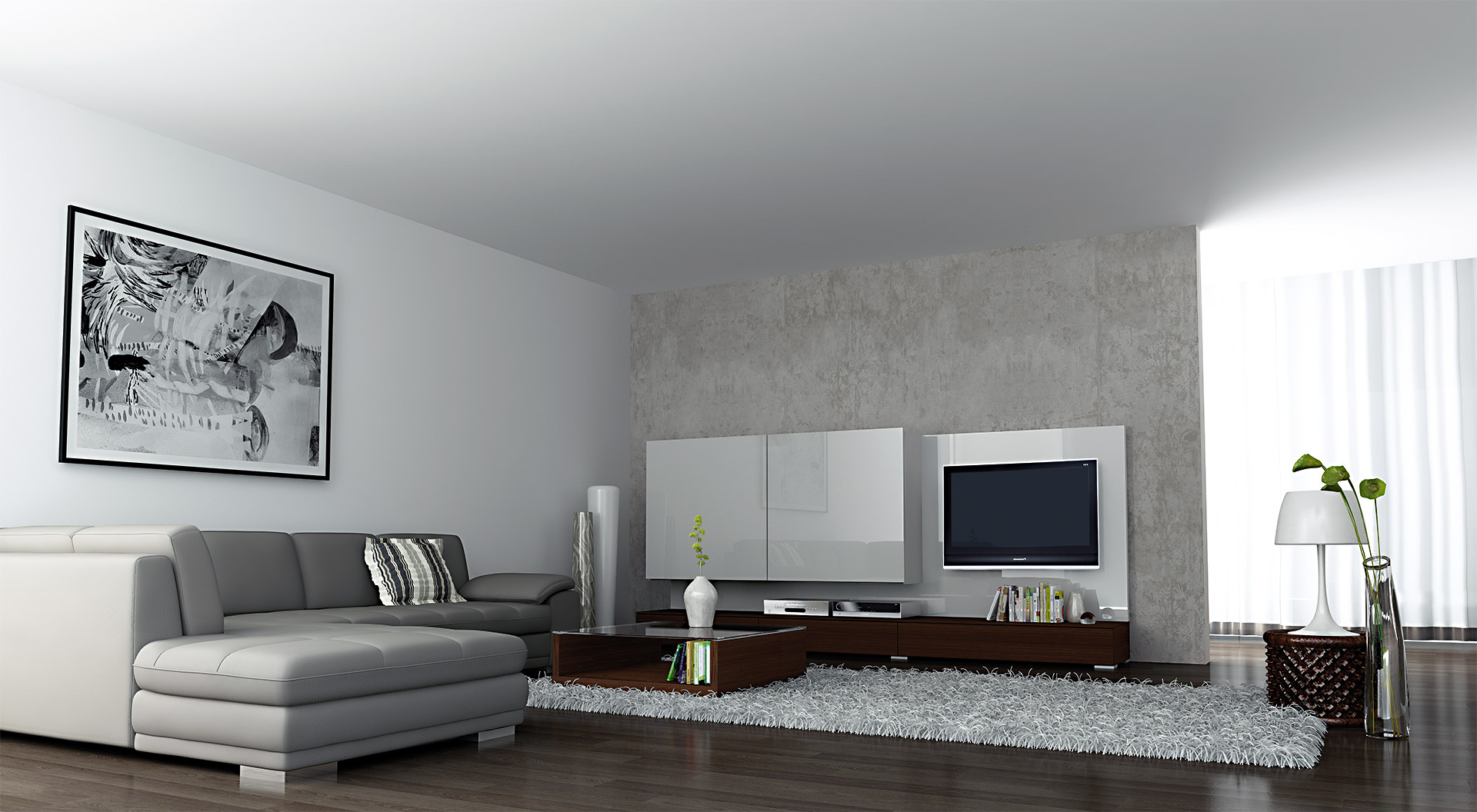 Další vydařená obývací stěna kombinující přírodní prvek versus hi-tech technologii, tedy matnou dýhu spolu s lakem ve vysokém lesku. Typické je precizní dýhování a lakování i uvnitř korpusů.